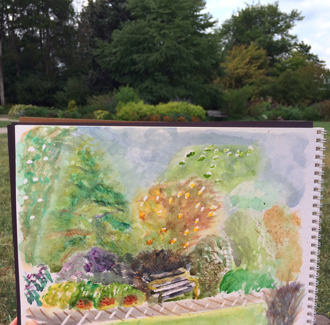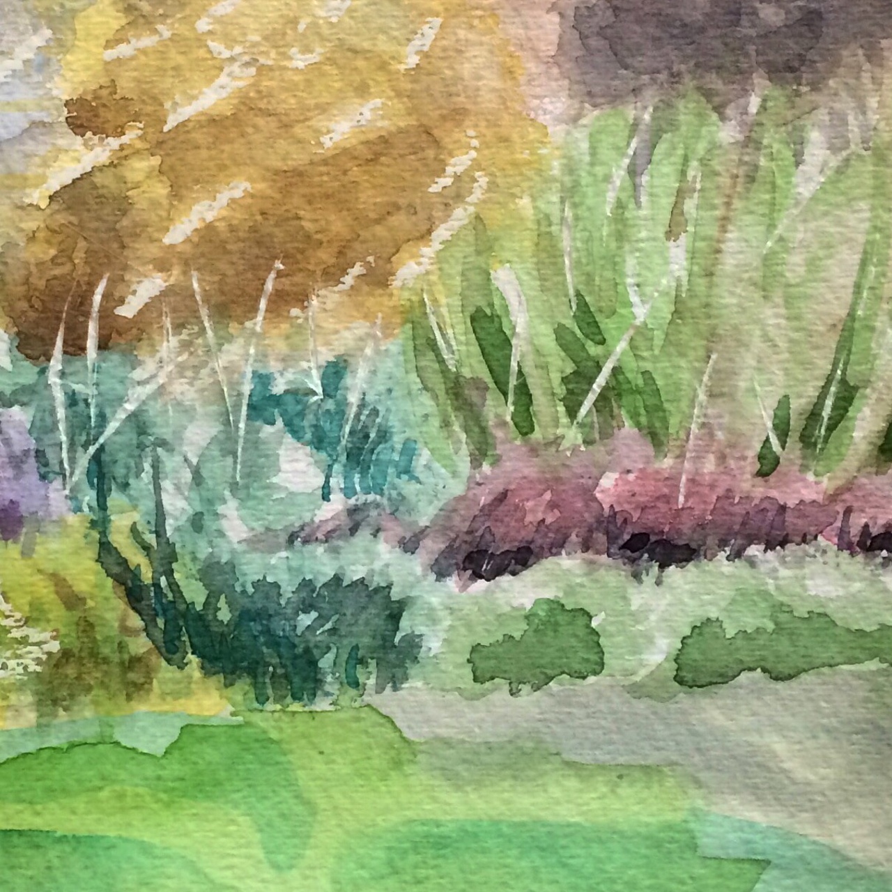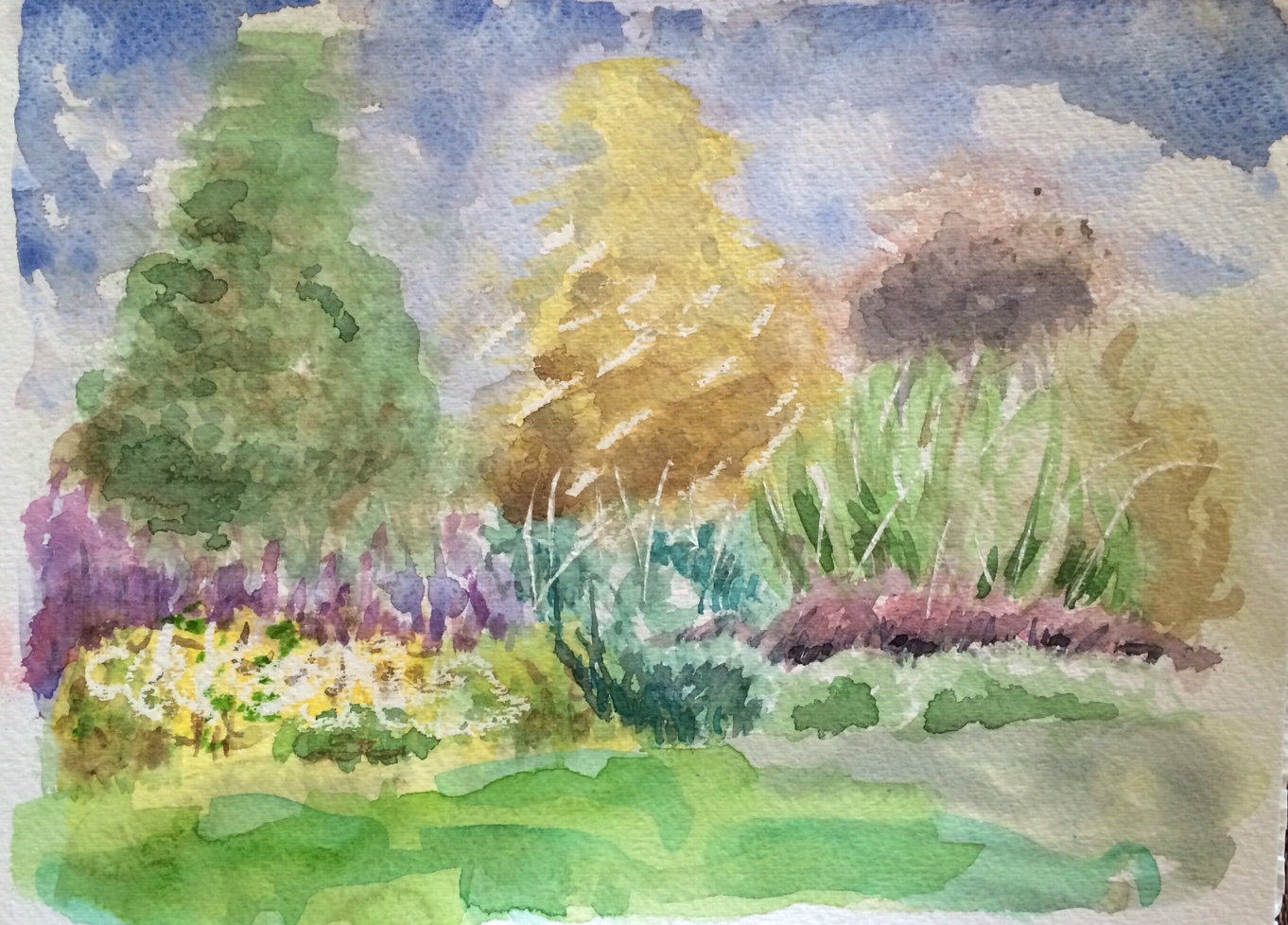Despite these seemingly clear instructions, I’m still anxious about the lack of a clear outcome.  It’s too wide open.  There are too many choices.  Do I sit on my towel or use my folding chair?  Which viewpoint do I choose?  Should I go for realism or abstraction?  Do I try to imitate local color or invent my own colors where I only see green?