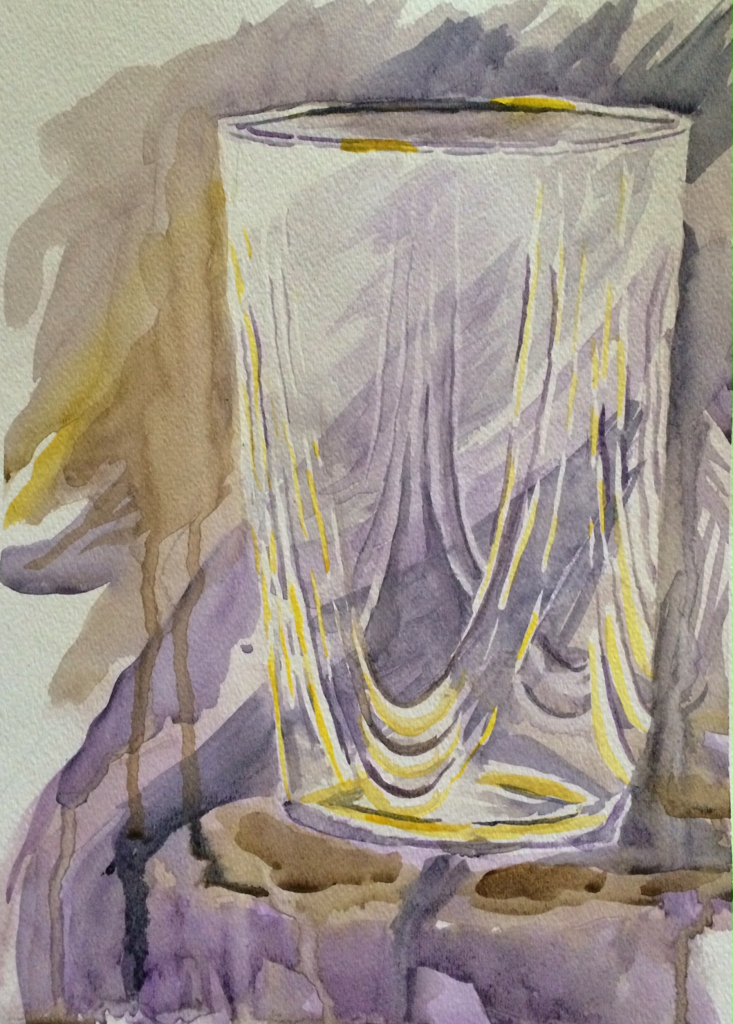 I explained that I was trying to create tension between the hard glass and soft cloth backdrop and apply a “mood” to an inanimate object. I planned my composition and technique to a certain point and then let my emotions take over. What I happened to be feeling that day was sadness. My painting told that story. I am comfortable sitting with sadness. My classmate was not.