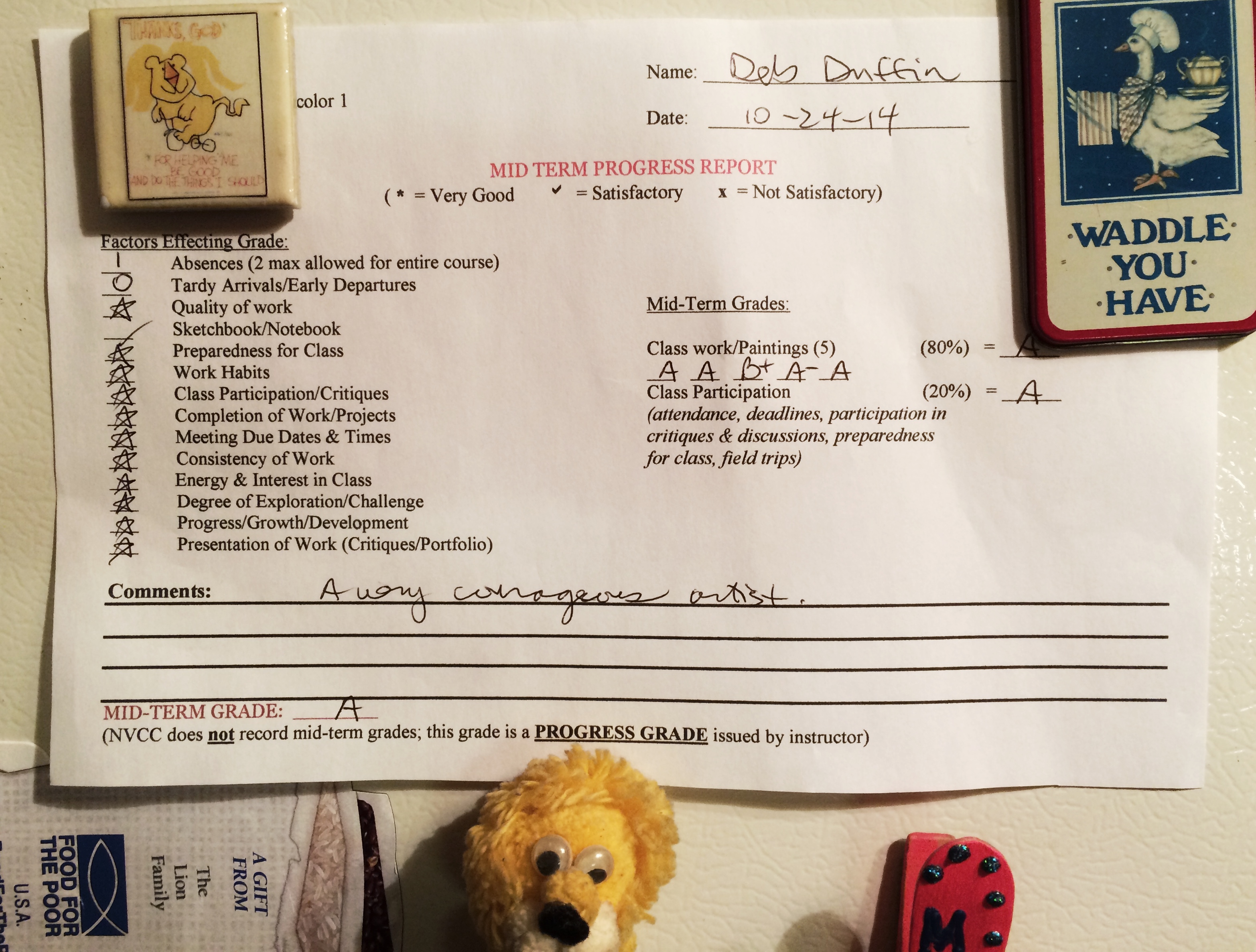 Although I’m now in my 40s, I gave my interim report card to my mom to put on her fridge. Mrs. C’s single comment, “A very courageous artist,” made my heart smile. Facing my fears was one of the main reasons for taking the class.